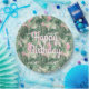 Este diseño tropical de hojas de plátano presenta un fondo rosa claro. En el centro hay un texto que dice "feliz cumpleaños".