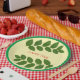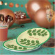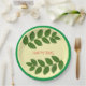 La moderna bahía verde deja sobre el fondo amarillo la placa Fiesta de papel. El texto de Happy Time puede ser personalizado.