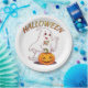 Un buen fantasma sonriente, con una calabaza sonriente, que nos saluda por un fiesta feliz.