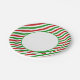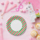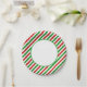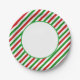 Party paper plate is shown with a festive holiday candy cane striped print.