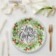 Feliz Navidad con letras de moda sobre un fondo de bayas y vegetación, estos platos de papel son geniales para tu hogar o para regalar como regalo. SINTONES Y MÁS diseños en nuestra tienda.