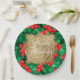 Felices vacaciones con letras blancas de moda sobre un chisme de Relieve metalizado de oro falso sobre un fondo de Navidades de bayas y hebillas, estos platos de papel también están personalizados con tu nombre. Ideal para tu hogar o regalo como regalo. SINTONES Y MÁS diseños en nuestra tienda.