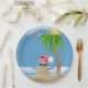 Hombre de nieve de arena con gorra de caldo rojo y blanco y gafas de sol. Navidades iluminan la palmera con luz solar brillante y fondo marino.