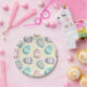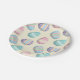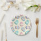 Estos platos de papel presentan bonitos huevos de Pascua decorados en colores pastel sobre amarillo.
