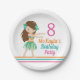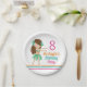 Un lindo plato de papel de cumpleaños hula chica con un niño bonito con una falda verde de hula y flores de hibisco en el pelo de la morena. Personalizar con el nombre de su chica de cumpleaños, edad y texto para un fiesta con tema Luau en la isla de Hawaii.