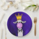 Platos de papel con una llama caprichosa que sopla una burbuja rosa mientras mastica chicle. Llevando una corona de oro y una corbata de arco negro. Fondo abstracto morado oscuro.
