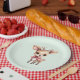 Platos de papel con el ilustracion de un adorable venado. Ojos grandes orejas grandes con una cabeza grande y pequeñas cuerdas marrones. Con un gran arco rojo.