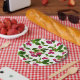 Placas de papel en una impresión dispersa de cerezas y hojas adaptadas a partir de huellas botánicas vintage - Fuchsia profunda cerezas rosa y borgoña y hojas verdes sobre fondo blanco