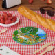 Paper plates in an impressionist style landscape of a small Mediterranean village with terracotta roofs and white walls, reflected in the water, and backed by mountains