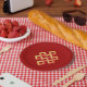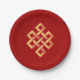 Plato De Papel Interminable nudo dorado sobre rojo burdeos