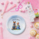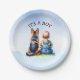 Placas de papel Baby Shower. Niño de color agua dulce con tirantes sentados al lado de un perro pastor alemán. Un gran toque para hacer que cada miembro de la familia se sienta especial.