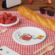 Un pedazo de pan tostado con mermelada y una cara feliz. Este diseño se ve realmente efectivo en estas placas de papel