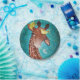 Una jirafa linda con los pequeños pájaros amarillos en su cabeza y un dandelionin su boca. Hecho en la pintura de acrílico tradicional con un fondo oscuro y azul claro y verde por Donna Leger. Todos los derechos reservados.