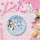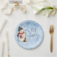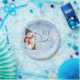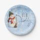 Este lindo plato de papel, diseño de Navidades en azul, presenta brillantes copos de nieve como telón de fondo para un gordo muñeco de nieve y el texto manuscrito 'Seamos felices'.