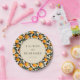 This vibrant wedding plate features a playful pattern of bright orange fruits and deep green leaves on a soft beige background, creating a lively and inviting atmosphere. The design is centered around an elegant circular frame with classic serif typography, making it perfect for personalization. Ideal for celebrating joyous occasions, the cheerful motif and modern style add a festive touch to any event.