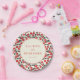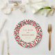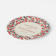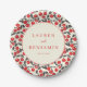 This wedding plate features a charming design with a repeating pattern of red cherries and dark green leaves on a cream background, creating a vibrant and elegant look. The central circle highlights customizable names and date in a mix of uppercase serif and script fonts, framed by a muted red outline that adds sophistication. The semi-realistic representation style blends traditional botanical elements with modern graphic design, evoking joy and celebration. Perfect for adding a festive touch to your wedding reception, this plate combines cheerful motifs with a classic aesthetic, making it an ideal choice for a memorable event.