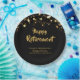 Diseño de estrellas de color negro y dorado con guión de broche HAPPY RETIREMENT. Personalice con el nombre del jubilado, años de servicio y nombre de la organización, si lo desea. Póngase en contacto con el diseñador a través de Zazzle Chat o makeitaboutyoustore@gmail.com si desea modificar este diseño, en otro producto o si desea coordinar elementos.