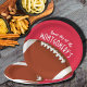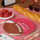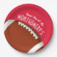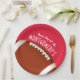 Las placas de papel de personalizable en 2 TAMAÑOS - 9" y 7" muestran un fútbol en rojo y las palabras "¡Es el Día del Juego!" junto con tu nombre. MÁS colores y elementos coincidentes en nuestra tienda.