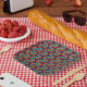Este diseño geométrico repite presenta formas de flores coloridas en una mezcla brillante de rojo, naranja, azul y verde azulado. El patrón es simétrico, y cada forma crea un efecto calidoscopio. Se vería muy bien en textiles, papel pintado u otros objetos de decoración.