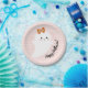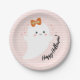 Adorables placas de papel de Halloween con un sonriente fantasma al estilo kawaii con mejillas rosadas y un arco, rodeado de suaves estrellas pastel sobre un fondo rayado rosado. Un diseño dulce y lúdico que es perfecto para fiestas infantiles de Halloween, celebraciones en el aula o reuniones familiares en octubre. Añade un toque alegre a la temporada espeluznante sin ser atemorizante.