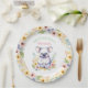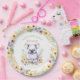 Un lindo oso koala sentado en un chica de flores rosadas, con platos de papel fiesta de cumpleaños personalizados.