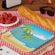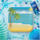 Vista panorámica de una playa de palmeras con un sol brillante. Este diseño parece realmente efectivo en estas placas de papel