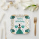 La invitación a este plato de cumpleaños incluye un marco dorado elegante, una bella princesa con piel oscura y un verde azulado vestido azul, flores y un globo. Esto es perfecto para una fiesta de cumpleaños.