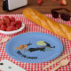 Divertidos platos de papel fiesta con un colorido ilustracion original de una bruja que volaba frente a una luna llena en una escoba con un gato negro y una linterna Jack-o'. ¡Mucha diversión en la fiesta de Halloween! Fondo azul.