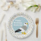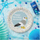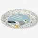 Crear suministros de fiesta personalizados para fiestas de cumpleaños y otros eventos especiales. Estas placas de papel presentan un ilustracion de estilo personalizado de una gaviota, un borde impreso de confeti festivo y su mensaje con letras blancas en negrita contra un fondo azul claro.
