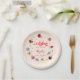 Cuidada temática de mariquita de bebé plato de ducha con ilustracion de bichos lindos rojos y rosas con flores silvestres. El texto dice "una pequeña mariquita está en camino".