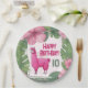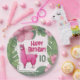 Pink Happy Smiling Lama, este diseño presenta un lindo y adorable Lama sonriente Rosa Happy Sonriente rodeado de palmeras verdes y flores tropicales rosas.