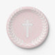 Una placa de papel bonita para un acontecimiento religioso en rosa con la frontera blanca del laurel y la cruz blanca con el starburst.  Artículos de coordinación disponibles.
