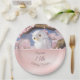 En la parte superior hay un bonito búho blanco sentado en una rama de flores de cerezo. Creado con IA. La parte inferior presenta un campo de texto dorado rosado/ rosa con un texto de cumpleaños personalizado. Platos de cumpleaños para chicas.