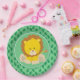Esta placa del fiesta ofrece un fondo verde con un modelo de repetición de las hojas de la selva. El león marrón y anaranjado de un clipart lindo del bebé se sienta en el centro de la placa.