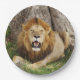 Juego de ocho placas de papel de 9" con la imagen de un hermoso león en la Reserva Nacional Maasai Mara.