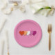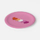 Paper plates with hearts in colors of lesbian pride flag, pride design on a pink background; orange, white, and pink hearts
