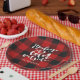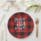La placa de papel festiva presenta cuadros de cuadros de búfalo rojos con tipografía blanca de "bebé hace frío afuera" de letra de pincel. Una adición de moda a tu fiesta de vacaciones.