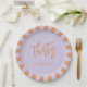 Es hora de que el fiesta celebre una fiesta de cumpleaños número 30 con este moderno plato de fiesta de cumpleaños con un esquema de color retro. Este sencillo y elegante diseño tiene un fondo lilac moderno con acentos de escritura manuscrita retro naranja mezclados con un moderno tipo de letra sans serif. El plato está bordeado por un patrón de lilas coordinadas y rayas naranjas retro. Personalice la plantilla de texto con el nombre y la fecha de su invitado de honor. Estas placas están disponibles en diámetro de 9 pulgadas y diámetro de 7 pulgadas. Se muestra aquí en un estilo de 9 pulgadas.