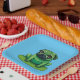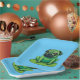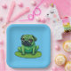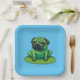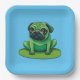 Pug verde lindo que se parece a una rana sentada en un lililipad. Se puede cambiar el color de fondo.