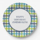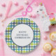 Estos elegantes platos de papel redondo personalizados son perfectos para añadir un toque especial a los fiestas. Están listos para ser personalizados con tu propio mensaje y cuentan con una manta de estilo de verificación que tiene un toque de adormidera con rayas de intersección dibujadas a mano de color verde limón, azul turquesa y azul marino sobre un fondo blanco.