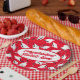 Si los colores de tu escuela son rojo y blanco, esta invitación a graduarse está cantando tu canción escolar. Platos de papel personalizados blancos y rojos para una fiesta de graduación. Tapones blancos de graduación y morteros arrojados al aire sobre un fondo rojo. Divertidos productos de papel para graduaciones de secundaria o universitarias.