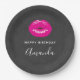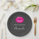 Platos de papel de cumpleaños con un ilustracion con labios rosados calientes. Imagen audaz y vibrante. Fijado sobre un fondo negro con mosaico.