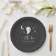 These Halloween baby shower plates from Redwood & Vine Design Co. feature a dark, moody backdrop with a sweet watercolor ghost, crescent moon, and scattered stars. The phrase “a little boo is almost due” adds the perfect playful touch for celebrating an autumn arrival. Ideal for serving cake, snacks, or treats at your spooky-chic baby shower.