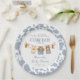 The center design showcases a watercolor clothesline adorned with sweet baby cowboy items — denim overalls, boots, hat, and a bandana — surrounded by a stylish blue and white cowhide border. Personalized text such as the honoree’s name and event date can be added for a unique, custom touch.