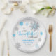 This beautiful & cute winter baby shower party Paper Plates features "A Little Snow Flake Is On The Way" winter themed soft blue and silver glittery decorative snowflakes and silver glitter border with elegant script. Welcome your little snow flake with this enchanting winter wonderland baby shower party Paper Plates. Personalise with your own details to set the tone for a cozy, magical gathering in honor of baby's upcoming arrivals. You can change the text, fonts ,colors and snow flakes colors by clicking personalise options.