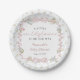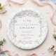 This elegant “Little Wildflower” baby shower paper plate features a romantic vintage floral pattern with soft blush pink bows, delicate blue ribbon accents, and dainty botanical details inspired by heirloom wallpaper designs. The graceful script “baby” lettering paired with classic serif typography creates a timeless, feminine aesthetic that instantly elevates your baby shower table décor.