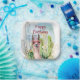Acuarela Llama con gafas en forma de corazón, y gorra de cumpleaños con un paisaje desértico al fondo.