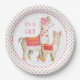 Platos de papel para baby shower de llama con adorables llama mamá y llama bebé niña en un bonito fondo de lunares rosados y dorados. Estos lindos platos de papel para baby shower de llama se pueden personalizar fácilmente para su evento simplemente agregando el texto que desee. También puede eliminar el texto.