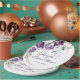 Hermosas peonías moradas, lavanda y blancas y verdes mezclados caen en cascada sobre elegantes letras y fuentes creando este lindo plato