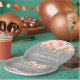 Un plato de papel de estilo rústico para una lluvia de regalos. Con dalias pintadas con acuarela en tonos rosados, melocotón y coral contemporáneos. Una pared de madera gris rústica como fondo. El nombre está escrito con letra manuscrita blanca.